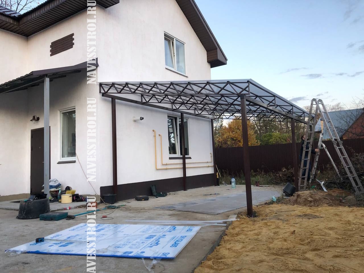 За день на даче изготовили арочный навес 5 на 7 с покрытием поликарбоната. Привезли уже готовые крашенные фермы и весь остальной материал. Все за собой убрали и увезли мусор. Молодцы!